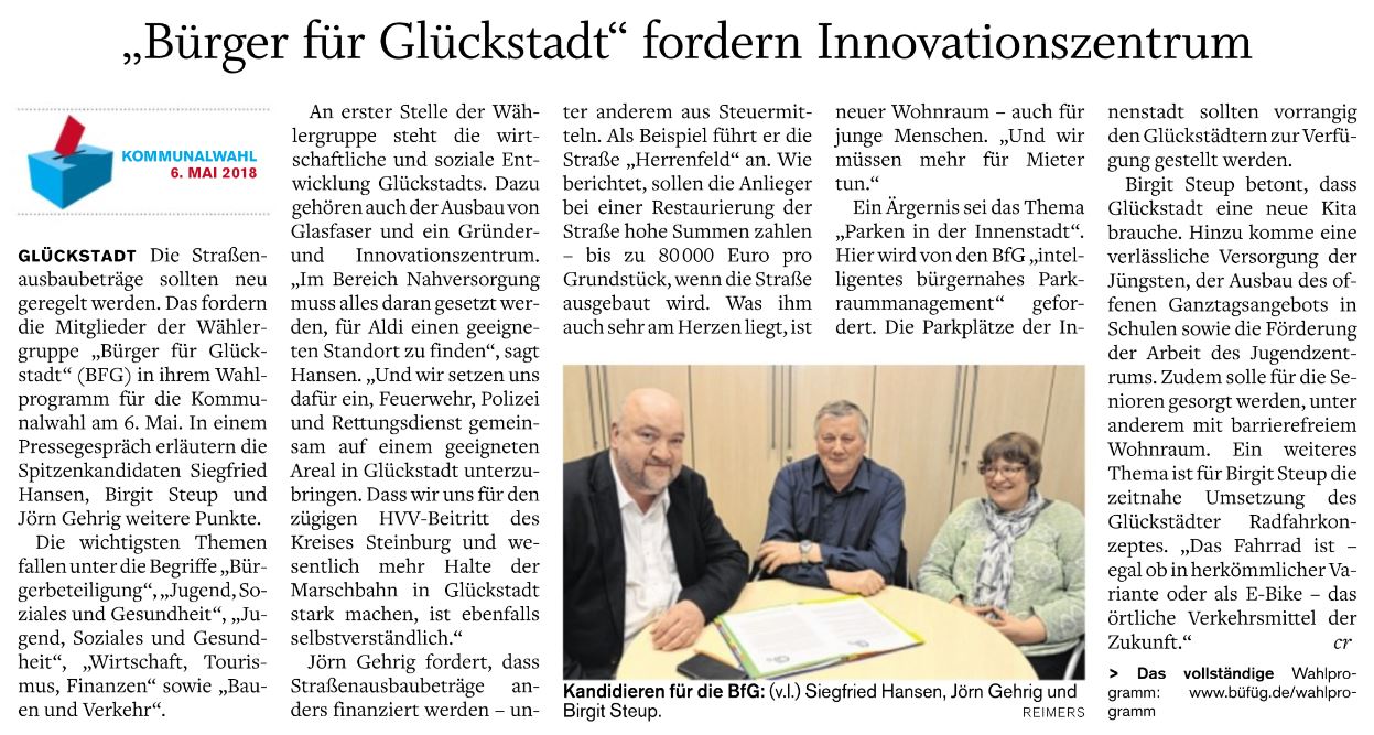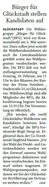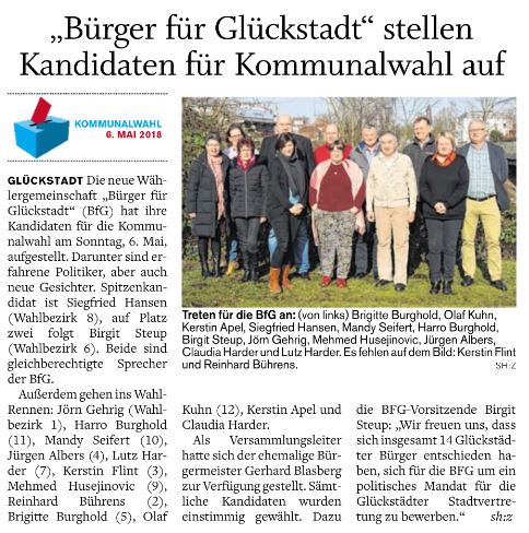 15.02.2018 – Pressebericht Glückstädter Fortuna: Bürger für Glückstadt stellen Kandidaten auf > Download