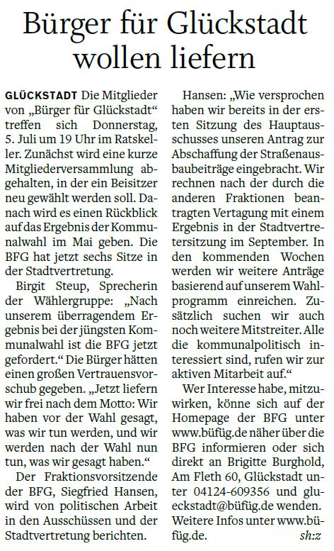 03.07.2018 – Pressebericht Glückstädter Fortuna: „Bürger für Glückstadt wollen liefern“ > Download
