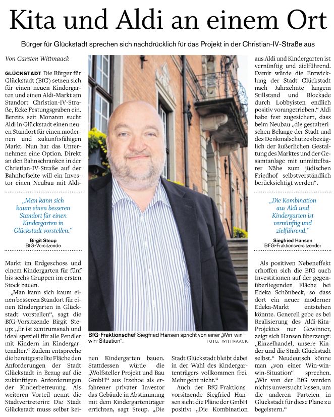 10.08.2018 – Pressemitteilung „Bürger für Glückstadt“: „Bürger für Glückstadt“ setzen sich für einen neuen Kindergarten und ALDI-Markt in der Christian-IV-Straße Ecke Festungsgraben ein > Download