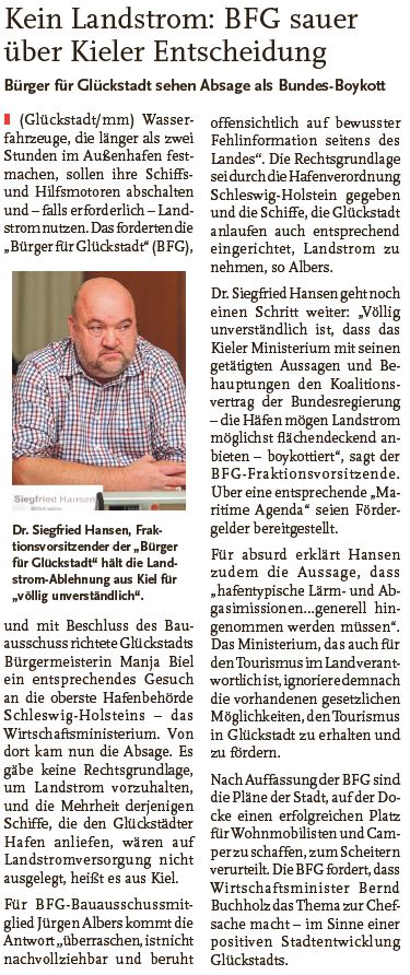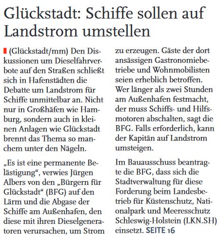 27.03.2019 – Pressebericht Holsteiner Allgemeine: „Kein Landstrom: BFG sauer über Kieler Entscheidung“ > Download