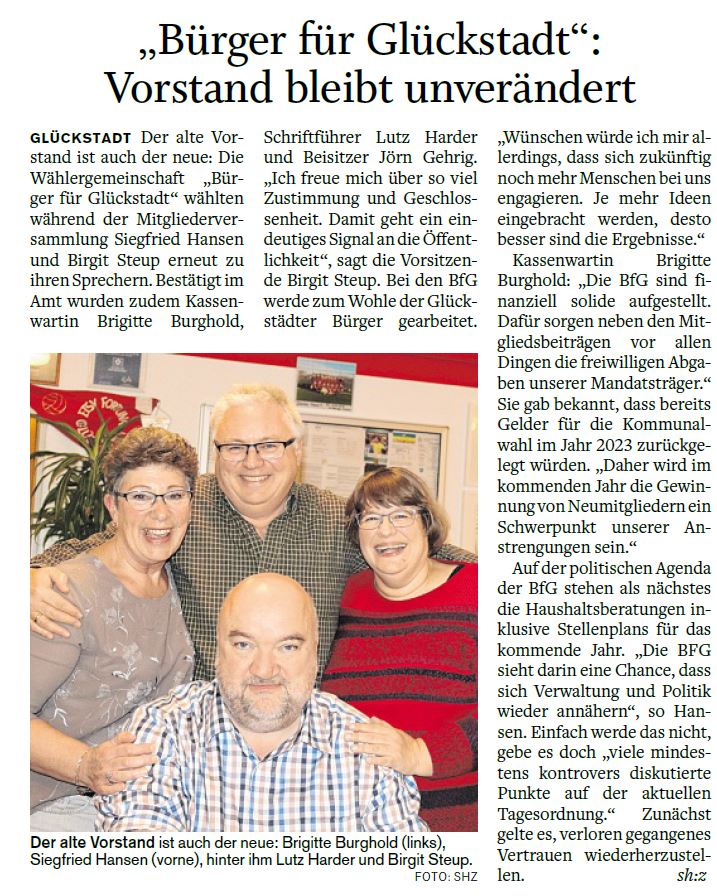 05.11.2019 – Pressemitteilung „Bürger für Glückstadt“: Kontinuität bei Vorstandswahlen > Download
