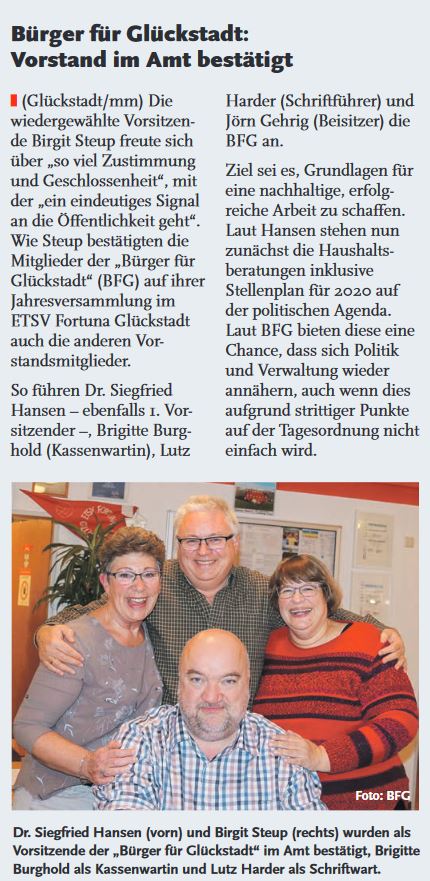 06.11.2019 – Pressebericht Glückstädter Fortuna:““Bürger für Glückstadt“: Vorstand bleibt unverändert“ > Download